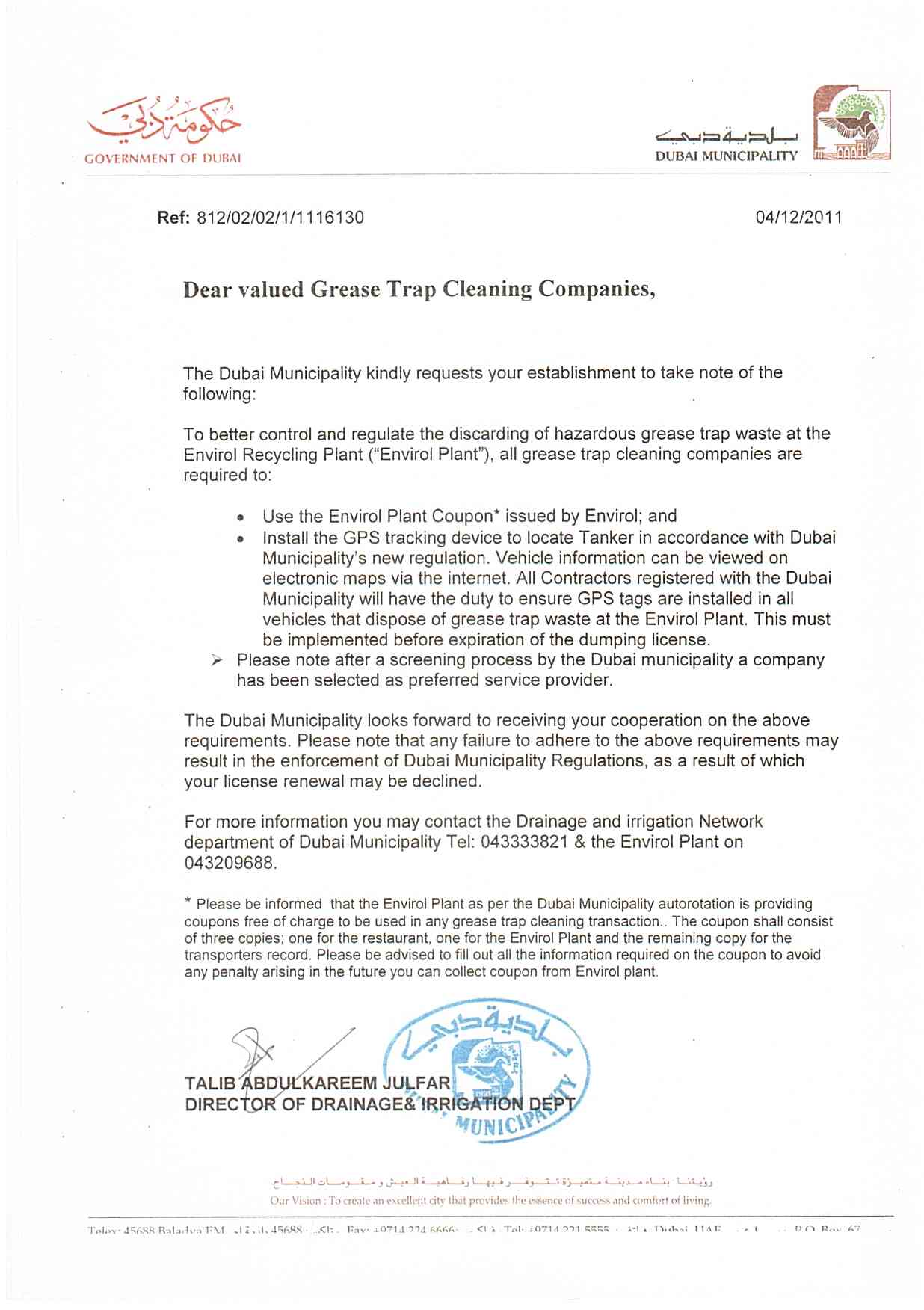 Installation of grease trap in every kitchen, cleaning of grease trap, sending mandatory report and kitchen should deal only with permitted grease trap contractor and all waste must be transported to Envirol for recycling.